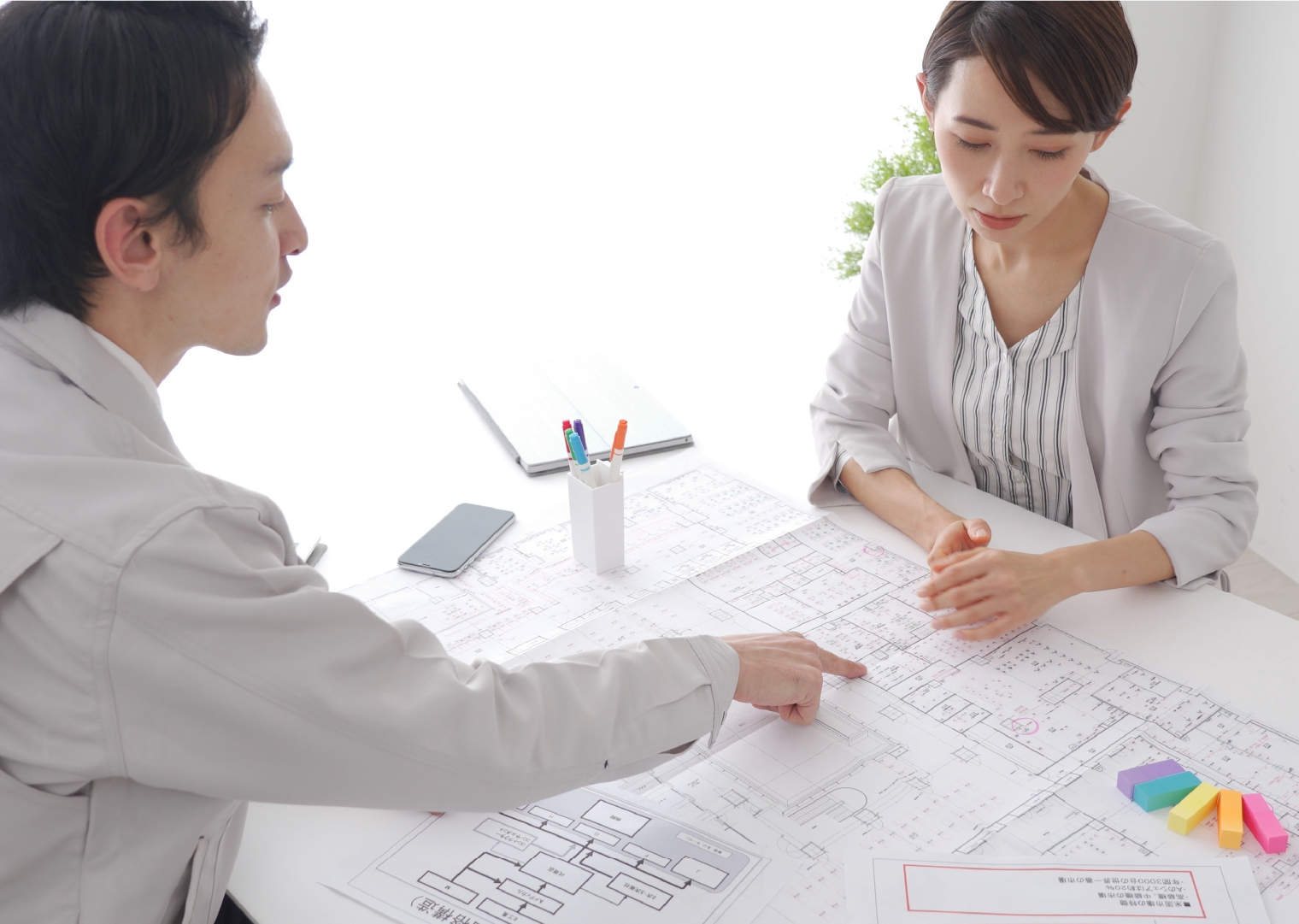 リーテックの再生建築は、調査や診断から、設計・施工まで、各工程のプロが一貫して担当します。お客様のご意向を一身に受けとめ、最適なソリューションをご提供できることを得意としています。